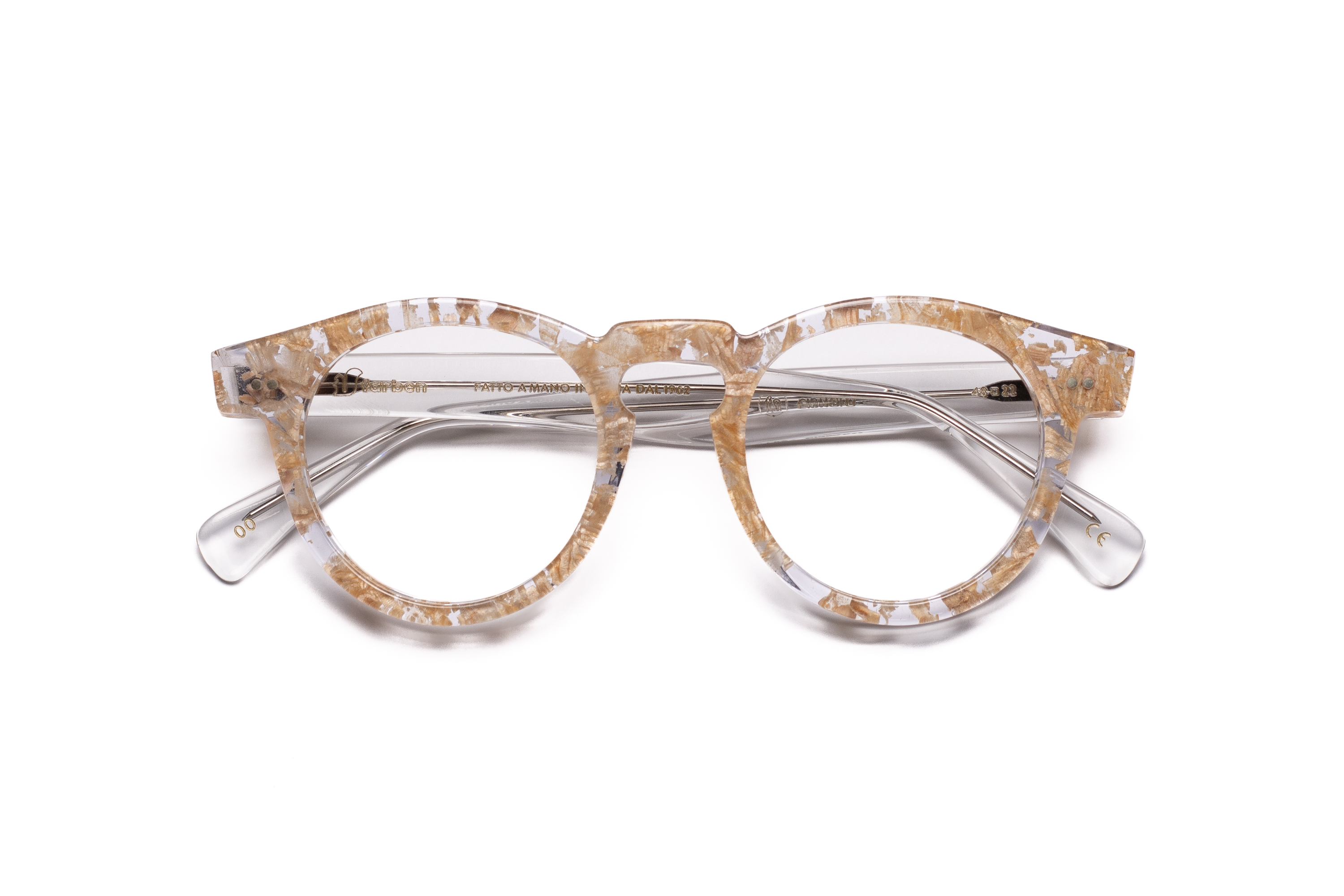 To return the suggestion of a walk through meadows and woods, we have enclosed in the frames of this series different types of plant substances among those that best tell the mountain environment: cornflower petals, ears, mosses, lichens and woods, that are collected and placed in several layers of cellulose Mazzucchelli 6 millimeters, through a delicate and complex manual process, unique. This particular processing allows us to create always different compositions on each individual piece, giving rise to “one of a kind” glasses.