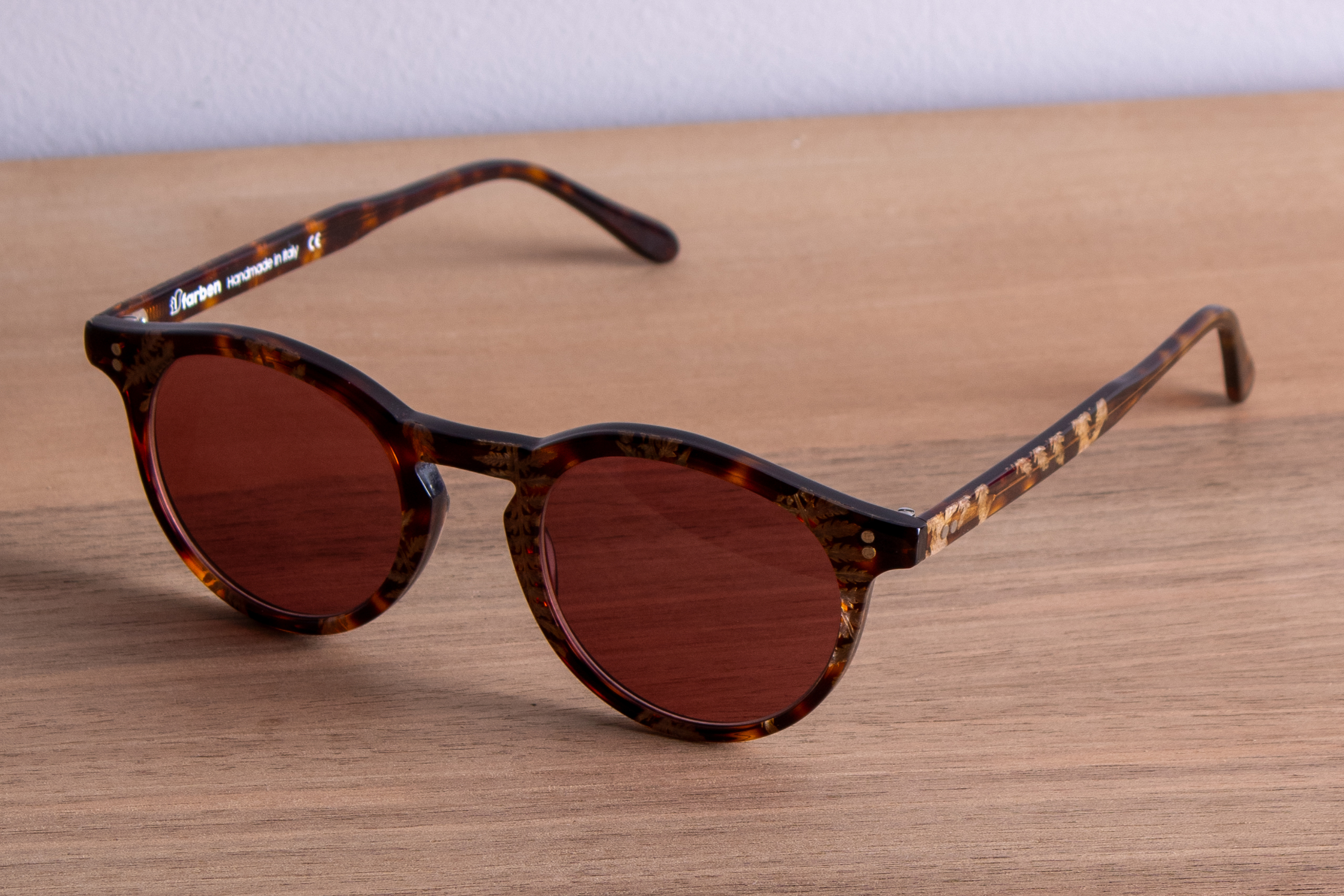 Per restituire la suggestione di una passeggiata tra prati e boschi, abbiamo racchiuso nelle montature di questa serie diversi tipi di sostanze vegetali tra quelle che meglio raccontano l’ambiente montano: petali di fiordaliso, spighe, muschi, licheni e legni, che vengono raccolti e inseriti in più strati di cellulosa Mazzucchelli 6 millimetri, attraverso un delicato e complesso procedimento manuale, unico nel suo genere.