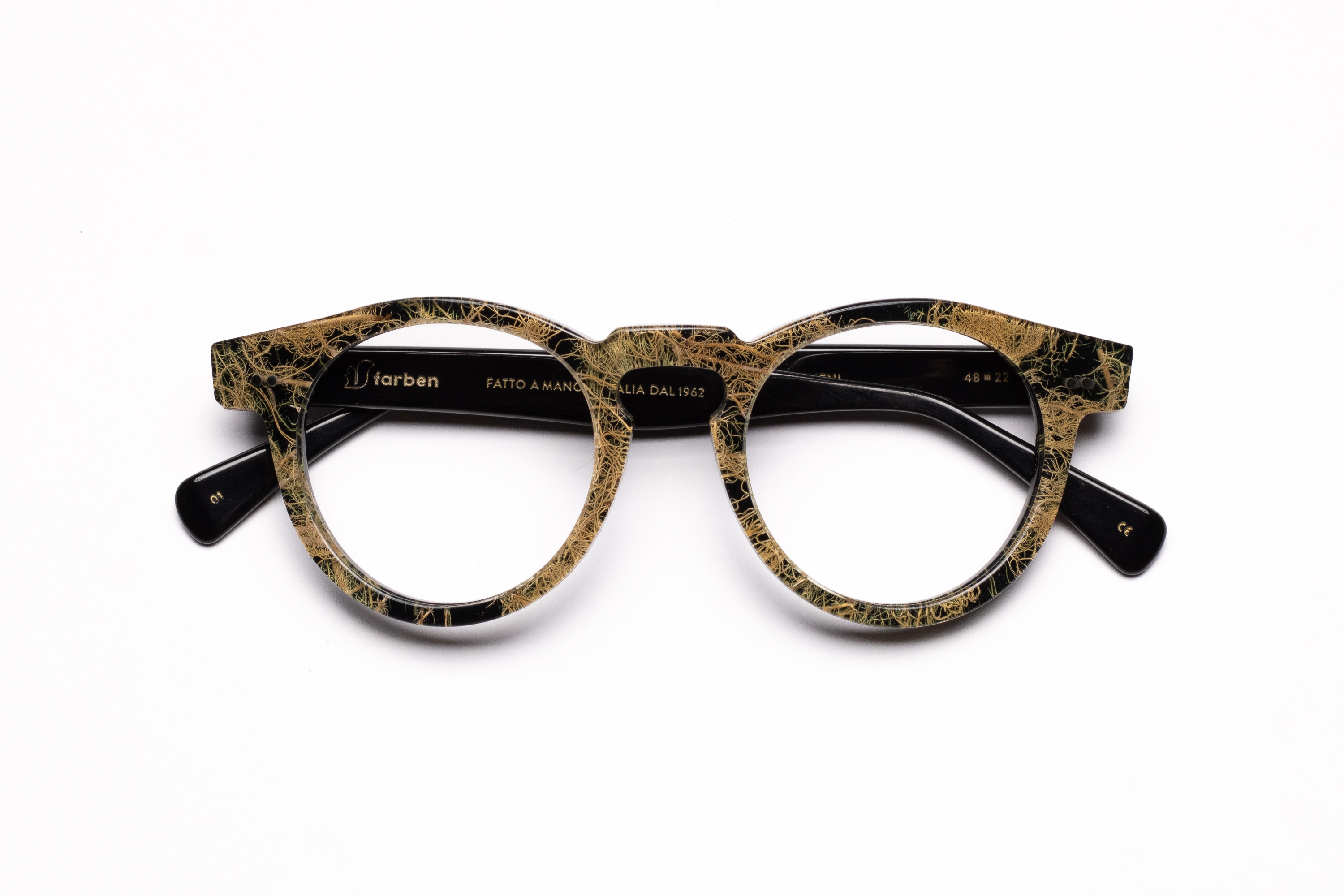 Per restituire la suggestione di una passeggiata tra prati e boschi, abbiamo racchiuso nelle montature di questa serie diversi tipi di sostanze vegetali tra quelle che meglio raccontano l’ambiente montano: petali di fiordaliso, spighe, muschi, licheni e legni, che vengono raccolti e inseriti in più strati di cellulosa Mazzucchelli 6 millimetri, attraverso un delicato e complesso procedimento manuale, unico nel suo genere.